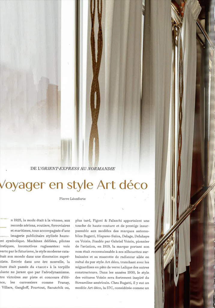 Architecte DPLG, fin connaisseur des arts décoratifs français et féru d’Art déco, Maxime d’Angeac s’inscrit dans la grande tradition des savoir-faire et de l’excellence. Admirateur de Jacques-Émile Ruhlman, Paul Dupré-Lafon et Adolf Loos, depuis son bureau parisien où il dessine à la pointe sèche, l’homme, qui a collaboré à ses débuts aux côtés de Hilton McConnico, ne nourrit aucune nostalgie : « Si le passé compte, le rétroviseur doit être mental, focalisé sur les références à bon escient, sinon on verse dans le pastiche et la copie ». L’exercice relève de l’équilibrisme, notamment avec l’Orient-Express dont les prototypes de cabines qu’il a réalisés sont présentés dans la nef du musée des Arts décoratifs (MAD), à Paris, à l’occasion de l’exposition « 1925-2025. Cent ans d’Art déco ». Monté à bord de l’Orient-Express, Maxime d’Angeac y oeuvre à titre de chef de train – comprendre directeur artistique de la marque Orient Express et architecte-designer du nouveau train Orient-Express qui sera lancé en 2027. Soit un convoi de 17 voitures attelées, entre wagons historiques des années 1926 à 1929 dûment restaurées et wagons contemporains avec cabines, salles de bain, toilettes. Exposés au MAD, la maquette échelle 1 des nouveaux wagon-bar, wagon-restaurant et suite sont mis en perspective avec une cabine historique de René Prou extraite de l’Étoile du Nord, aujourd’hui entrée dans les collections du MAD. « Pour le projet du nouvel Orient-Express, j’ai dessiné de nouveaux objets, de nouveaux décors tout en respectant la table des matières originelle : boiseries vernies, velours, marbre, quincaillerie, etc. Certains éléments ont fait l’effet d’une récupération quasi archéologique. Aucune copie, aucune reproduction ! Et ce sera la même chose pour le voilier Orient Express, le Corinthian, qui appareillera en 2026″. Maxime d’Angeac y a tout conçu, et même logé une cabine historique du train !
