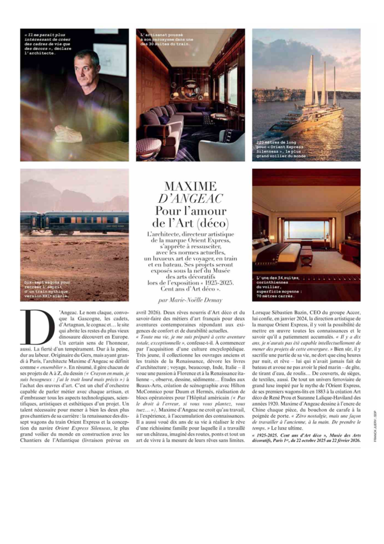 D’Angeac. Le nom claque, convoque la Gascogne, les cadets, d’Artagnan, le cognac et… le site qui arite les restes du plus vieux dinosaure découvert en Europe. Un certain sens de l’honneur aussi. La fierté d’un tempérament. Dur à la peine, dur au labeur. Originaire du Gers, mais ayant grandi à Paris, l’architecte Maxime d’Angeac se définit comme « ensemblier ». En résumé, il gère chacun de ses projets de A à Z, du dessin (« Crayon en main, je suis besogneux : j’ai le trait lourd mais précis ») à l’achat des oeuvres d’art. C’est un chef d’orchestre capable de parler métier avec chaque artisan, d’embrasser tous les aspects technologiques, scientifiques, artistiques et esthétiques d’un projet. Un talent nécessaire pour mener à bien les deux plus gros chantiers de sa carrière : la renaissance des dix-sept wagons du train Orient Express et la conception du navire Orient Express Silenseas, le plus grand voilier du monde en construction avec les chantiers de l’Atlantique (livraison prévue en avril 2026). Deux rêves nourris d’Art déco et du savoir-faire des métiers d’art français pour deux aventures contemporaines répondant aux exigences de confort et de durabilité actuelles.