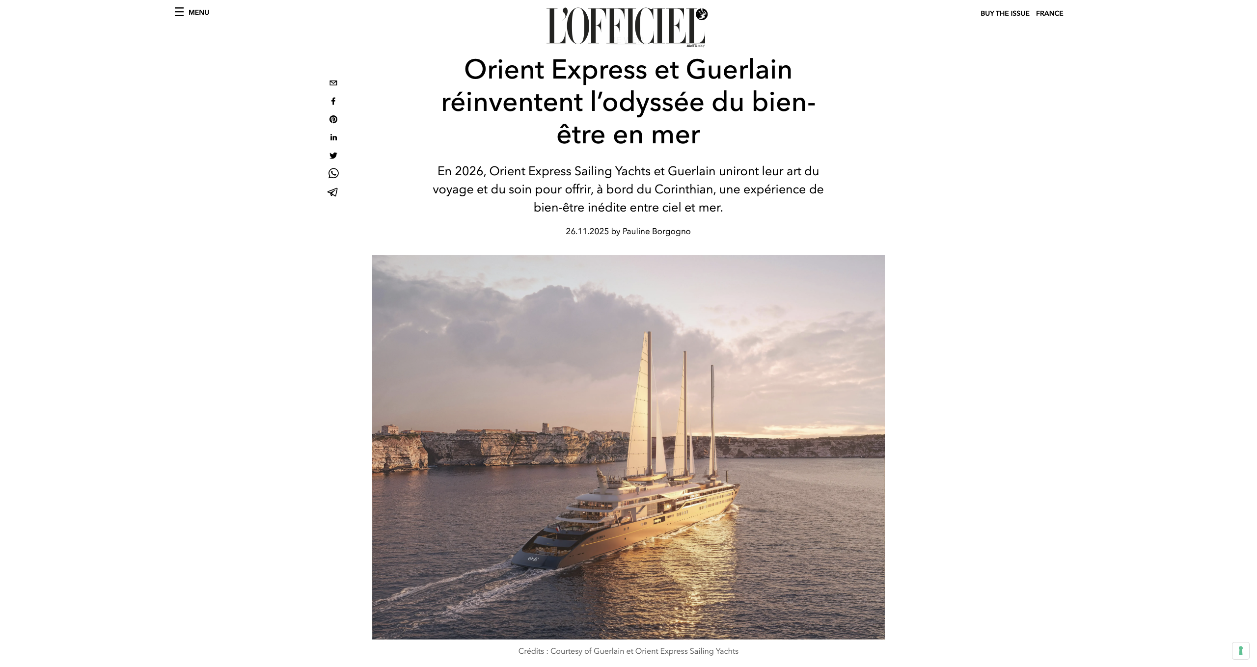 En 2026, Orient Express Sailing Yachts et Guerlain uniront leur art du voyage et du soin pour offrir, à bord du Corinthian, une expérience de bien-être inédite entre ciel et mer.