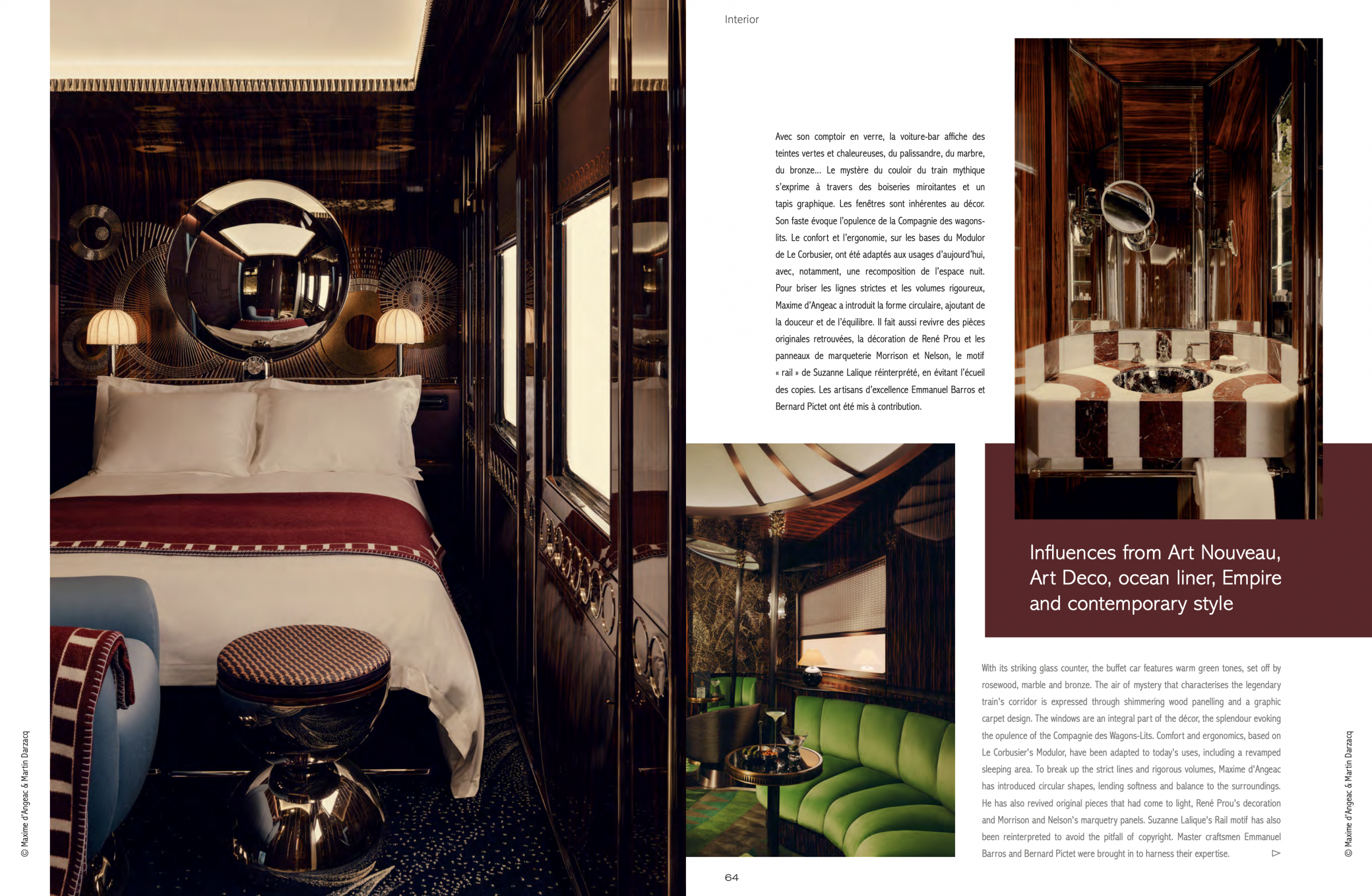 Maxime d’Angeac débute sa carrière, dansles années 1990, en collaborant avec des maisons de luxe. Son style, dialogue entre patrimoine et modernité, exprime une élégance feutrée sans ostentation. Ses activités, concentrées, depuis 2021, sur l’Orient-Express, s’imposent comme le projet d’une vie.